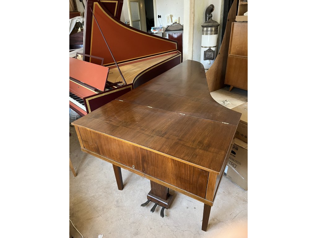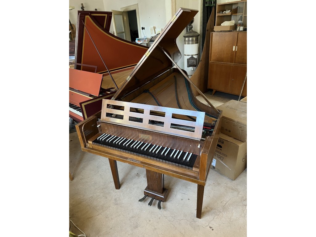 Velmi pěkné moderní cembalo z roku 1935 vyrobené německou firmou Neupert. Velmi kvalitně řemeslně zpracovaný nástroj, se specifickým mechanicky znějícím zvukem moderních cembal. Nástroj ideální především pro věrnou interpretaci hudby 20. století. Klaviatura je oproti historickým nástrojům lehce tvrdší, ale nikterak rušivě. Trsnutí je v prstech cítit velmi zřetelně. Nástroj také velmi rychle repetuje, díky dřevěným trsacím sloupkům zatíženým olověným zavažím. Jako plektra slouží delrin, původně však byla osazená kožená plektra, které lze po domluvě obnovit. Rozsah je FF-f3 s dispozicí 8,8, dělenou loutnou a velice kuriózním flažoletovým zařízením. Jedná se o jakousi lištu s oplstěnými kovovými plíšky, která se při sešlápnutí pedálu posune ke strunám vprostřed jejich délky, tím se jeden z 8-stopých rejstříků stane rejstříkem 4-stopým s velmi unikátním flažoletový charakterem zvuku.