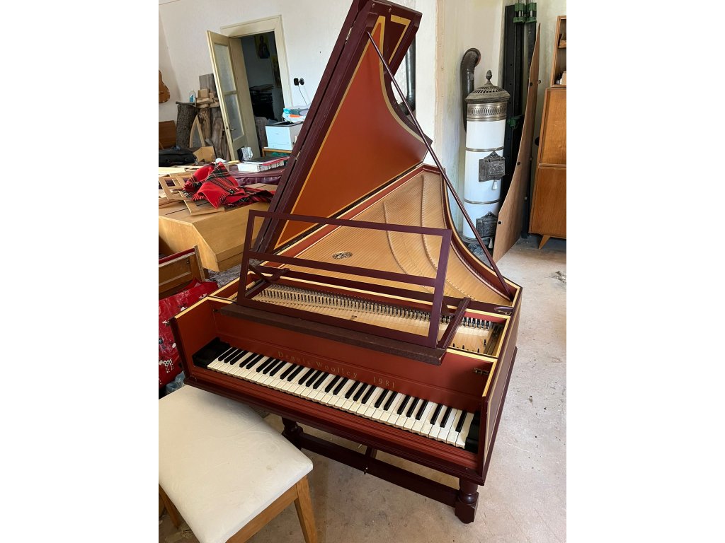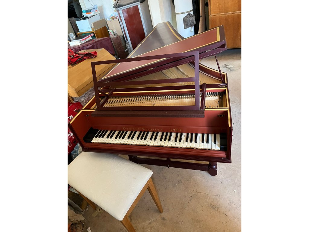 Jednomanuálové vlámské cembalo. Větší nástroj se silným a vytříbeným zvukem s, pro jednomanuál neobvyklou, dispozicí 8,8,4, loutna. Mechanika je velmi precizní a příjemná, z dřevěnými trsacími sloupky na všech rejstřících. Klaviatura je potažená hovězí kostí, má rozsah od FF do g3 a je vybavena transpozičním zařízením. Jako plektra slouží delrin. Ostrunění: železo, žlutá a červená mosaz. Délka nástroje je 246cm, šířka pak 96. Hmotnost cca 60 kg. Výrobce: Dennis Woolley Anglie 1981